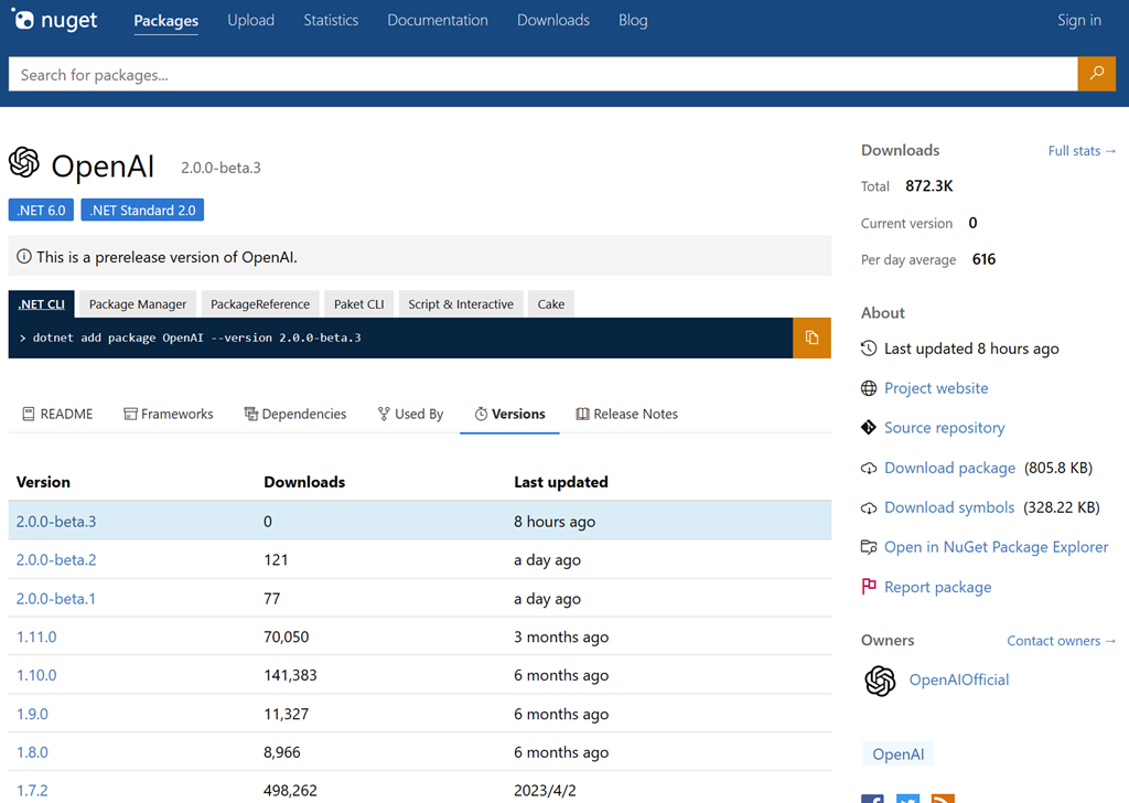 - [1]2.0.0-beta.3:https://www.nuget.org/packages/OpenAI/2.0.0-beta.3