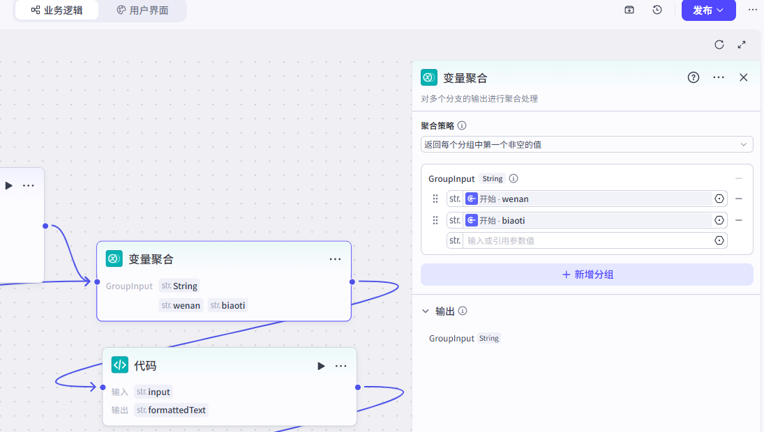入参是一个分组(GroupInput),接收2个输入参数,一个是"wenan",另一个是参数"标题",返回参数(group)。