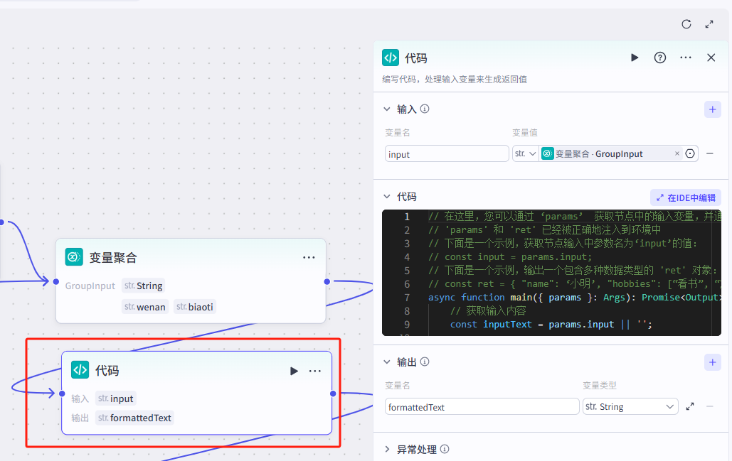 // 在这里,您可以通过'params' 获取节点中的输入变量,并通过 'ret' 输出结果 // 'params' 和 'ret' 已经被正确地注入到环境中 // 下面是一个示例,获取节点输入中参数名为‘input’的值: // const input = params.input; // 下面是一个示例,输出一个包含多种数据类型的 'ret' 对象: // const ret = { "name": ‘小明’, "hobbies": [“看书”, “旅游”] }; async function main({ params }: Args): Promise<Output> { // 获取输入内容 const inputText = params.input || ''; // 1. 合并连续的换行符为一个 const mergedNewlines = inputText.replace(/[nr]+/g, 'n'); // 2. 仅替换单独的换行符(即前后不是换行符的) // 使用负向后行断言和负向前瞻断言 const formattedText = mergedNewlines.replace(/(?<!n)n(?!n)/g, ','); // 构建输出对象 const ret = { "formattedText": formattedText }; return ret; }
