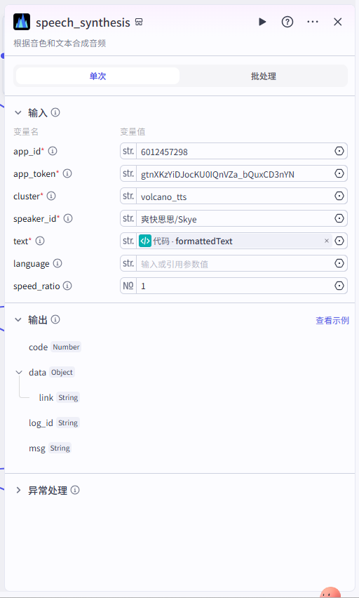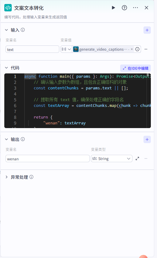 async function main({ params }: Args): Promise<Output> { // 确认输入参数为数组,且包含正确结构的对象 const contentChunks = params.text || []; // 提取所有 text 值,确保处理正确的字段名 const textArray = contentChunks.map(chunk => chunk.text).join('||'); return { "wenan": textArray }; }