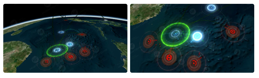 本次图扑软件运用自研 HT for WebGIS 产品,以军演演习形式对核潜艇在水下航行、隐蔽部署、武器发射、战术打击等作战环节进行虚拟仿真,生动展现其在复杂战场环境中的生存能力、协同作战效能和战略威慑作用。