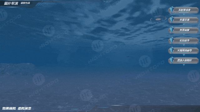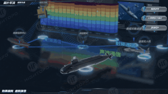 图扑基于 HT 强大的 3D 渲染能力,将复杂的海洋环境、核潜艇外观及作战流程(如机动与阵位部署、打击指令生成、潜艇通信验证、发射筒预冷操作、弹头解锁、水下弹射、潜艇规避机动等)进行直观动态的三维可视化呈现。