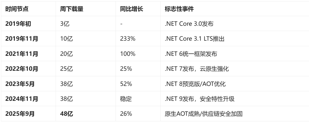 今天看上周的下载数据量已经突破48亿。我将从发展轨迹、驱动因素、安全挑战和未来趋势四个维度综合分析.NET生态的演进。以下关键里程碑数据直观展示了增长态势: